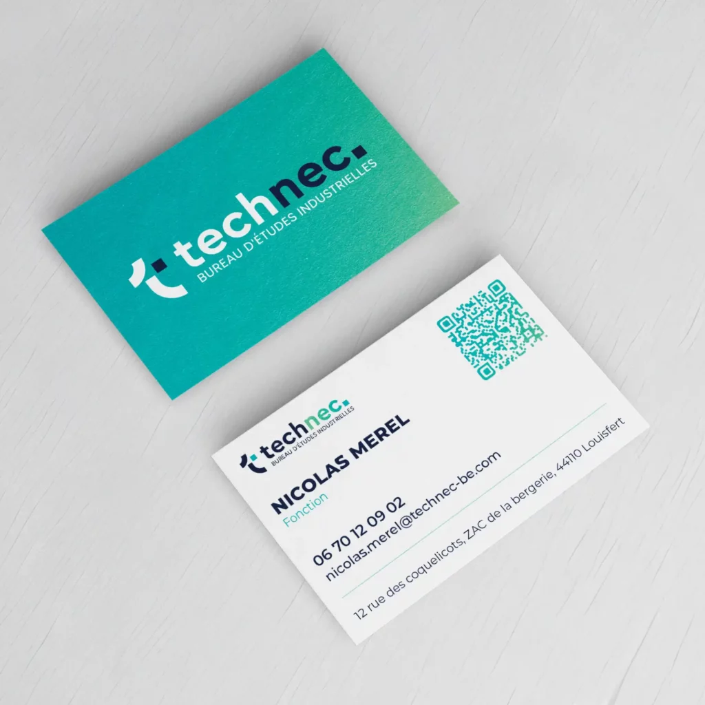 Le choix d’une typographie bas de casse s’est imposé très rapidement (humilité vs ostentation), la double couleur vient en soutien du nom de marque pour en faciliter la lecture, quant au sigle du « t pointé », il devient naturellement un marqueur fort de l’identité Technec.